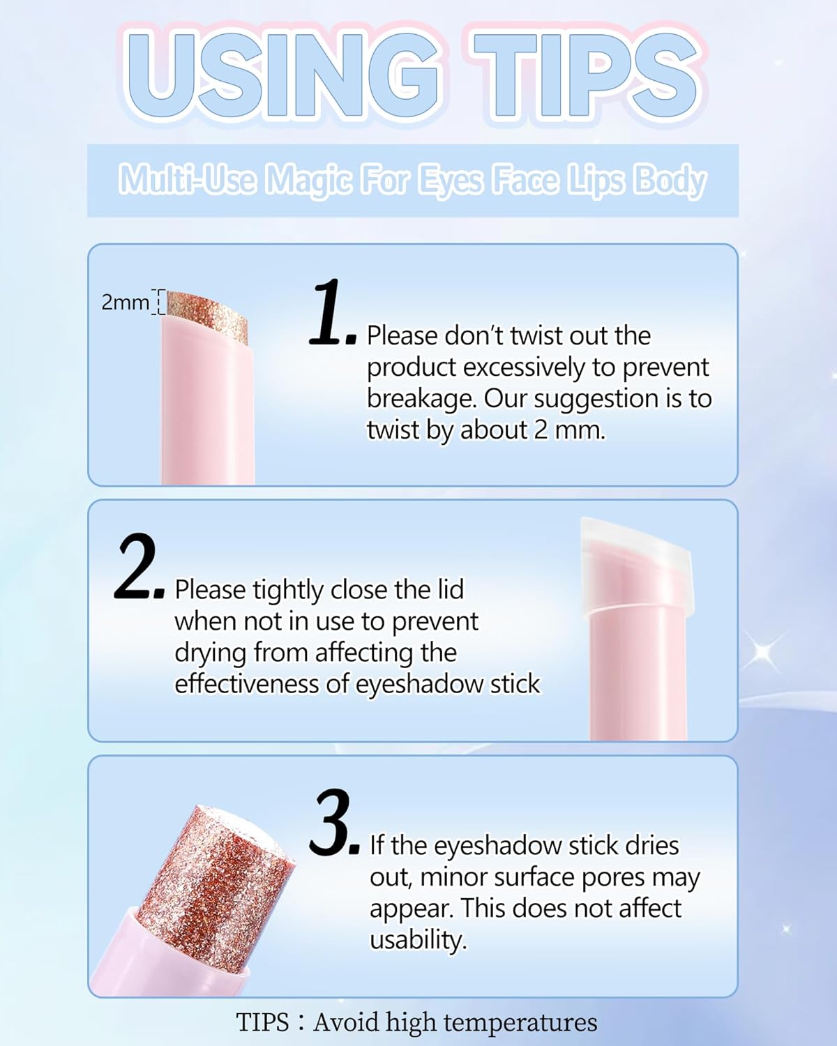All-Day Wear — Say goodbye to smudges and fade-outs! Our glitter eyeshadow keeps shimmer vibrant all day. The highlighter stick resists creasing and fading from daily wear, locking in bold color without smudges. Make your makeup shine without worry. The eye shadow stick is also crafted with a gentle, skin-friendly formula, safe for your skin – enjoy worry-free eye beauty from dawn to dusk.
