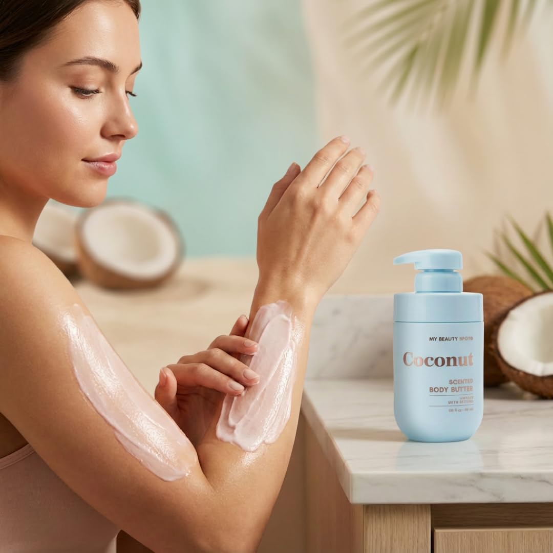 Indulge your skin in deep, lasting hydration with My Beauty Spot Coconut Scented Body Butter, a rich, multi-use moisturizer designed for the body, hands, and dry areas that need extra care. This luxurious body butter delivers intense moisture while leaving your skin soft, smooth, and delicately scented with a warm, tropical coconut fragrance. Infused with Retinol, this formula helps support smoother-looking skin over time while nourishing dryness caused by daily exposure, frequent hand washing, or environmental stressors. The creamy, fast-absorbing texture melts effortlessly into the skin without feeling greasy, making it ideal for everyday use. Perfect as a body butter, hand cream, or all-over lotion, this versatile moisturizer elevates your daily skincare routine with a balance of hydration, comfort, and subtle scent.