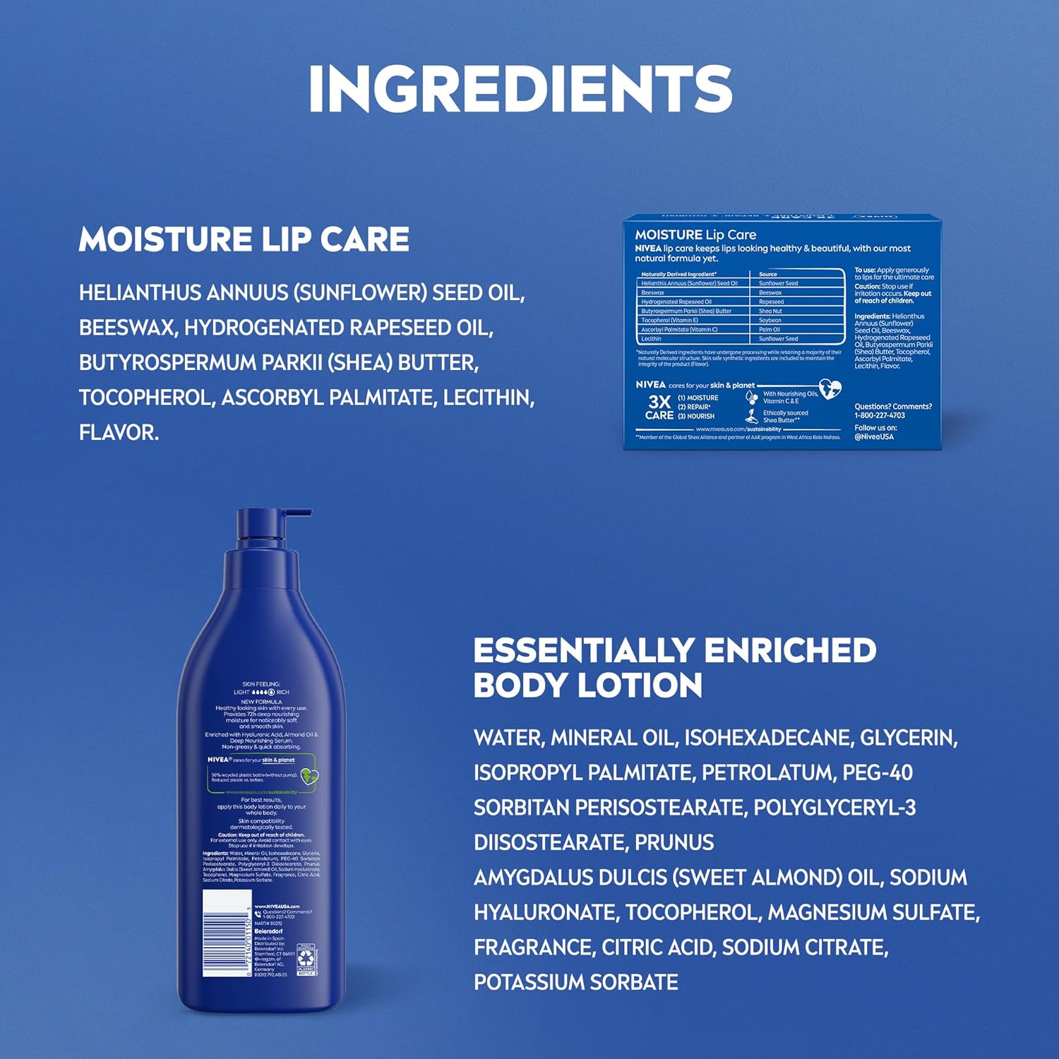 SKIN CARE SET INCLUDES: Two 16.9 fluid ounce bottles of NIVEA Essentially Enriched Body Lotion and four 0.17 ounce NIVEA Moisture Lip Care Lip Balm Sticks