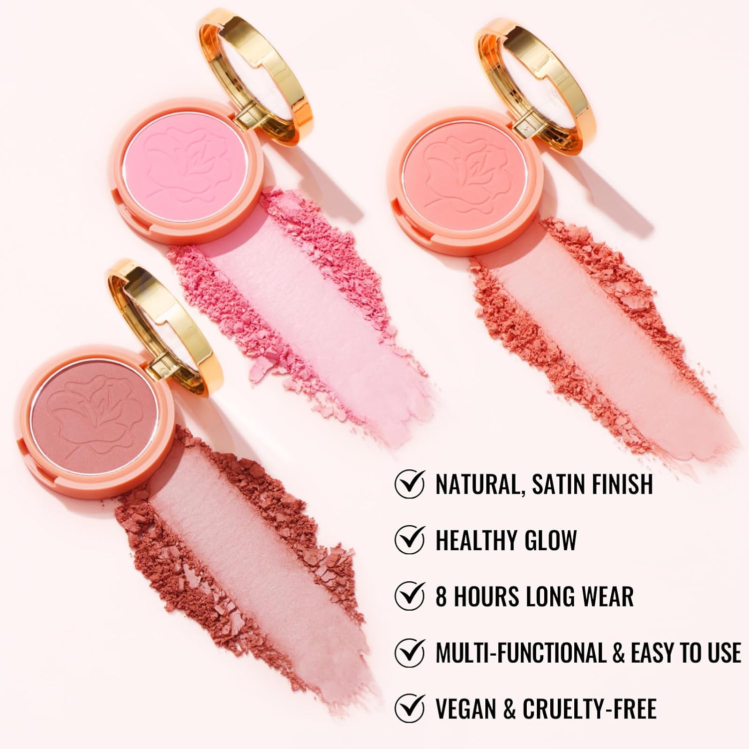 Creamy sliky texture, easy to use, buildable blushMutiple tasking: as blush, highlighter, eyeshadow topperFree of parabens, phthalates and animal-derived ingredients
