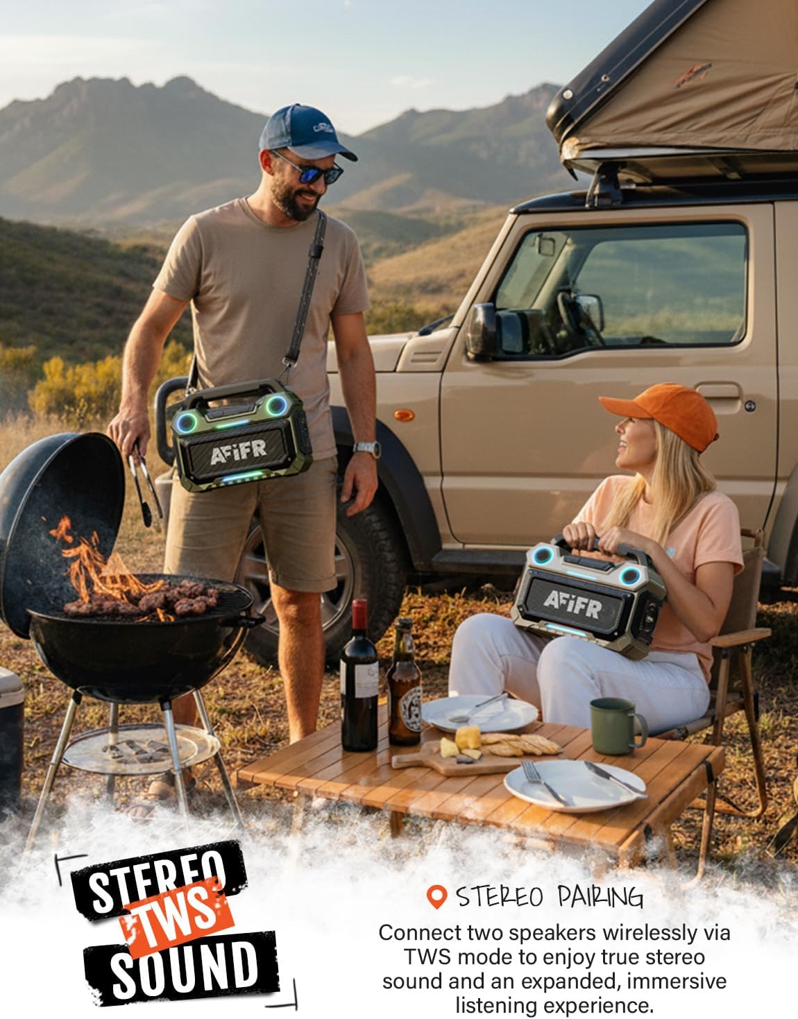 SEAMLESS STEREO & BLUETOOTH 5.3: Enjoy fast, stable wireless connectivity with advanced Bluetooth 5.3 technology. Pair two portable Bluetooth speakers together for enhanced stereo sound—ideal for a beach party, outdoor barbecues, or any adventure that demands powerful, immersive audio.