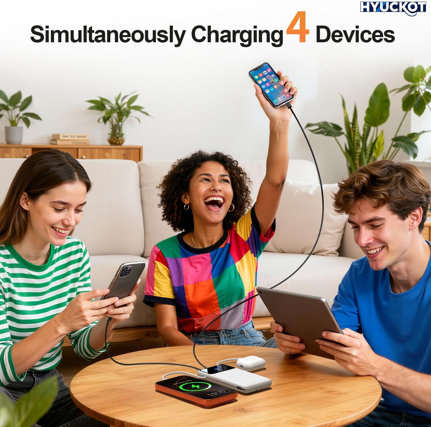 [Charge Up to 4 Devices at Once — Up to 15W Efficient Fast Charging] Built for multi-device users, the all-in-one portable charger power bank lets you power up to 4 devices at the same time using built-in cables, a USB-C port, and a USB-A port. Up to 15W fast charging, ensuring your phone, tablet, earbuds, or smartwatch all get efficient, reliable power without waiting in line to charge.