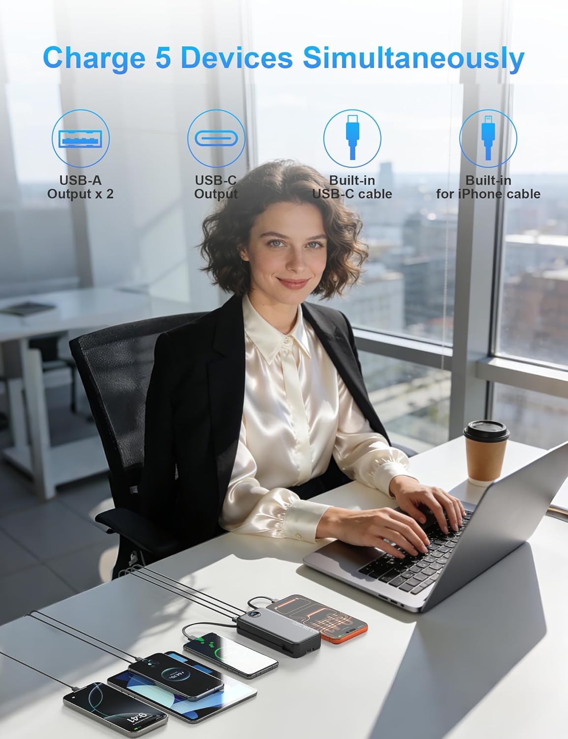 High Speed Battery Bank: USB C output port can full charge Phone 12 Pro within 50 min, the inbuilt Type C cable support 18W power deliver, charge Galaxy S10 to 50% in 35 minutes, USB-A2 only need 1 hour to charge an Phone 14 with it’s 22.5W fast charging, our phone charger portable refill 5 devices simultaneously.