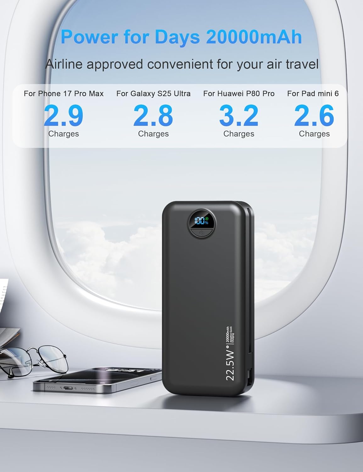 Small Size but High Capacity: This portable battery pack has the compact 5.90 x 2.67 x 1.02 inch size, 12.8oz weight, effortless to carry. 20000mAh Li-ion battery can charge for Phone 15 Pro Max 3.2 times, for Samsung Galaxy S22 Ultra 2.8 times, for Huawei P50 Pro 3.2 times, for pad mini 6 2.6 times, let your device full of energy.