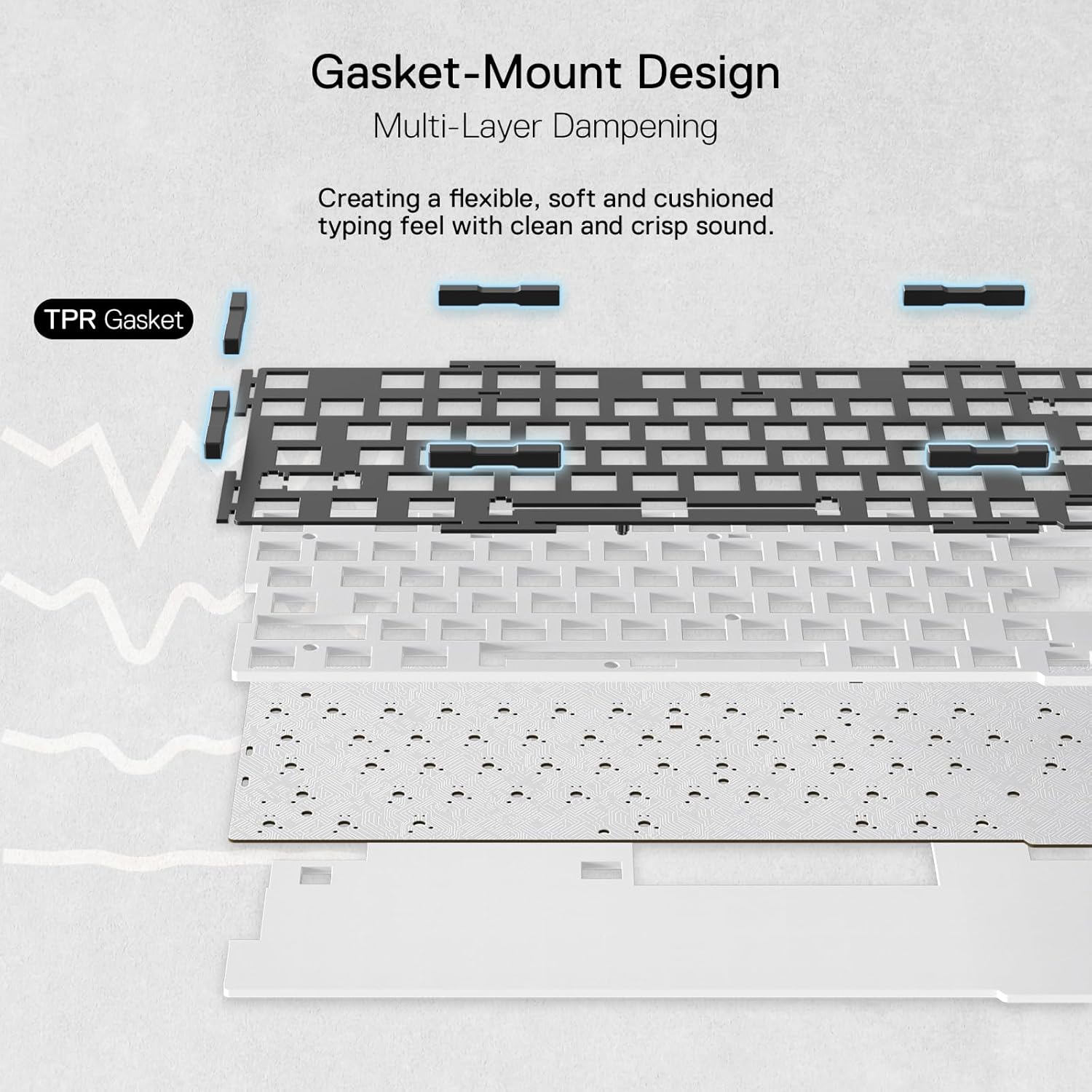 Noise Dampening x 5 – Equipped with 3.5mm PO foam, IXPE switch foam, PET sound pad, bottom socket foam, silicone bottom pad along with the silicone gasket. Significantly reduce the hollow noise, creating dampened and ultra-clean typing acoustics, making each keystroke satisfying and comfortable.