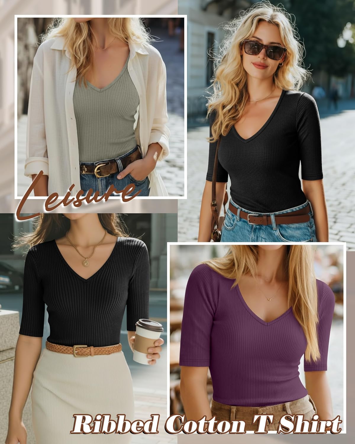 Riyiper 3 Pack Women’s Half Sleeve Top Elbow Length Ribbed Cotton T Shirt Women V Neck Summer Tee Slim Fit Casual Blouses