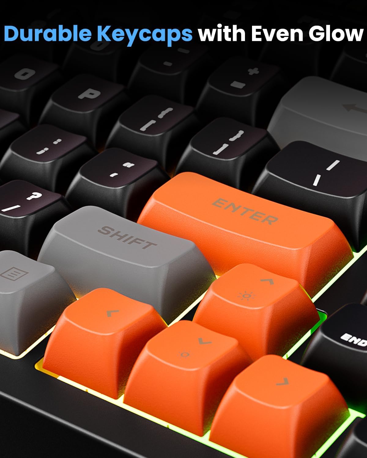 【Durable Keycaps with Even Glow】Engineered for 10 million keystrokes, these keycaps resist wear and deformation. A unique textured surface diffuses RGB light evenly across each key, ensuring crisp, glare-free visibility and fade-resistant legends for years