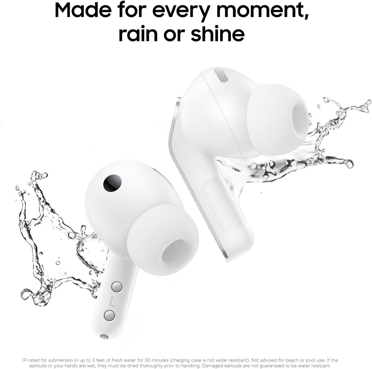 MADE FOR EVERY MOMENT, RAIN OR SHINE: Peace of mind comes standard with Samsung wireless Galaxy Buds4 Pro, thanks to a water-and dust-resistant design⁵ and an IP57 rating that’s built for life on the go.