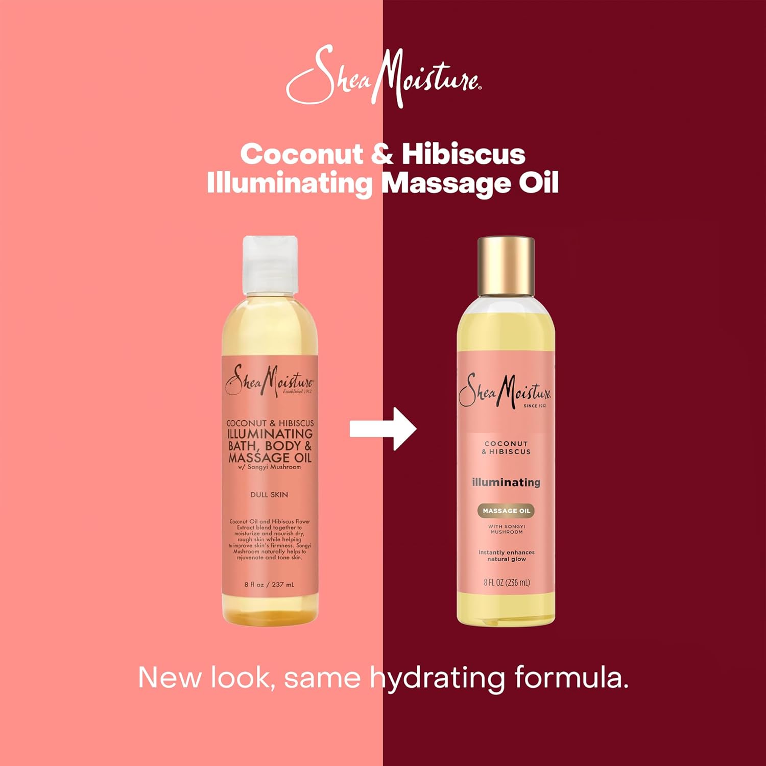 NEW LOOK, SAME MOISTURIZING MASSAGE OIL: The rich body oil, infused with Fair-Trade shea butter, songyi mushroom, and hydrating hibiscus, softens and firms your skin—without phthalates, parabens, mineral oil, or sulfates.