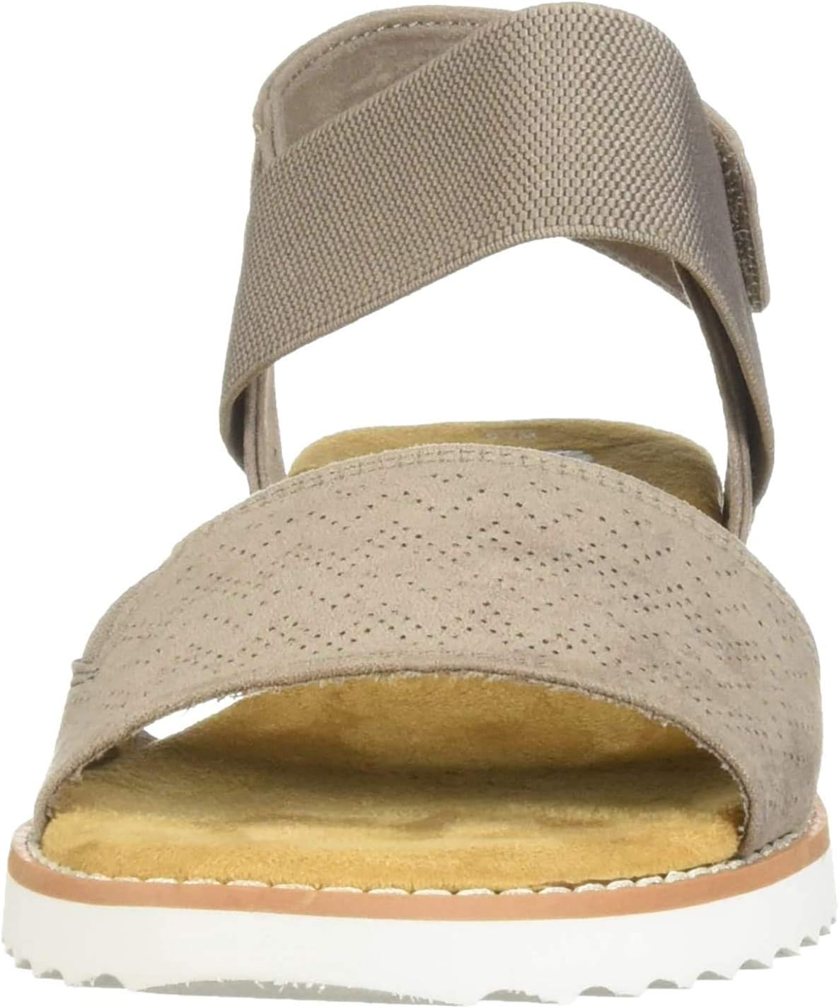 Relax your style with comfort in warm weather with the Desert Kiss SKECHERS BOBS sandal. Soft faux suede and stretch fabric upper in a casual comfort sandal with stitching inserts. Memory Foam Footbed