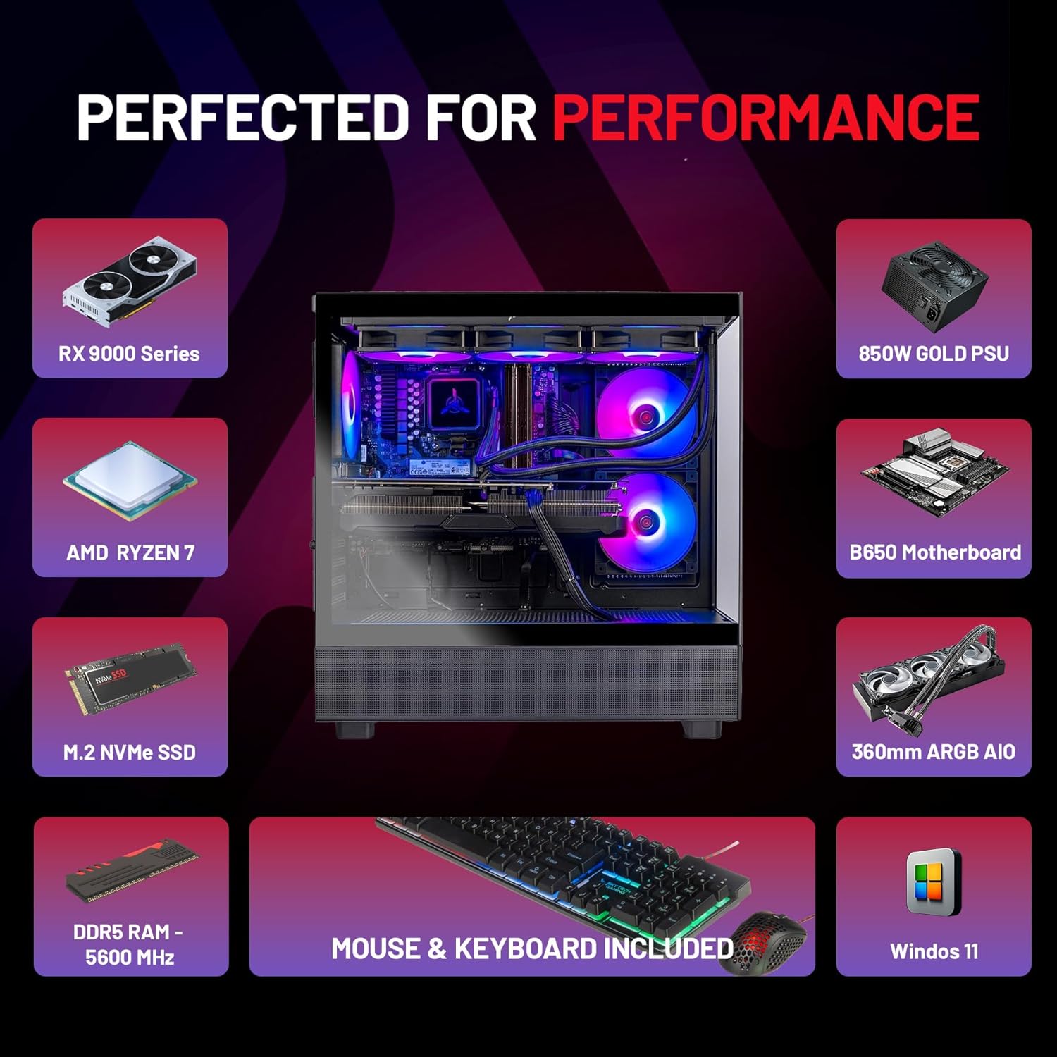 AMD Ryzen 7 9800X3D 4.7GHz (5.2GHz Turbo Boost) CPU Processor | 1TB NVMe M.2 SSD – Up to 30x Faster Than Traditional HDD | 360mm AIO Liquid CPU Cooler with ARGB Fans, say goodbye to outdated and inefficient air coolers.