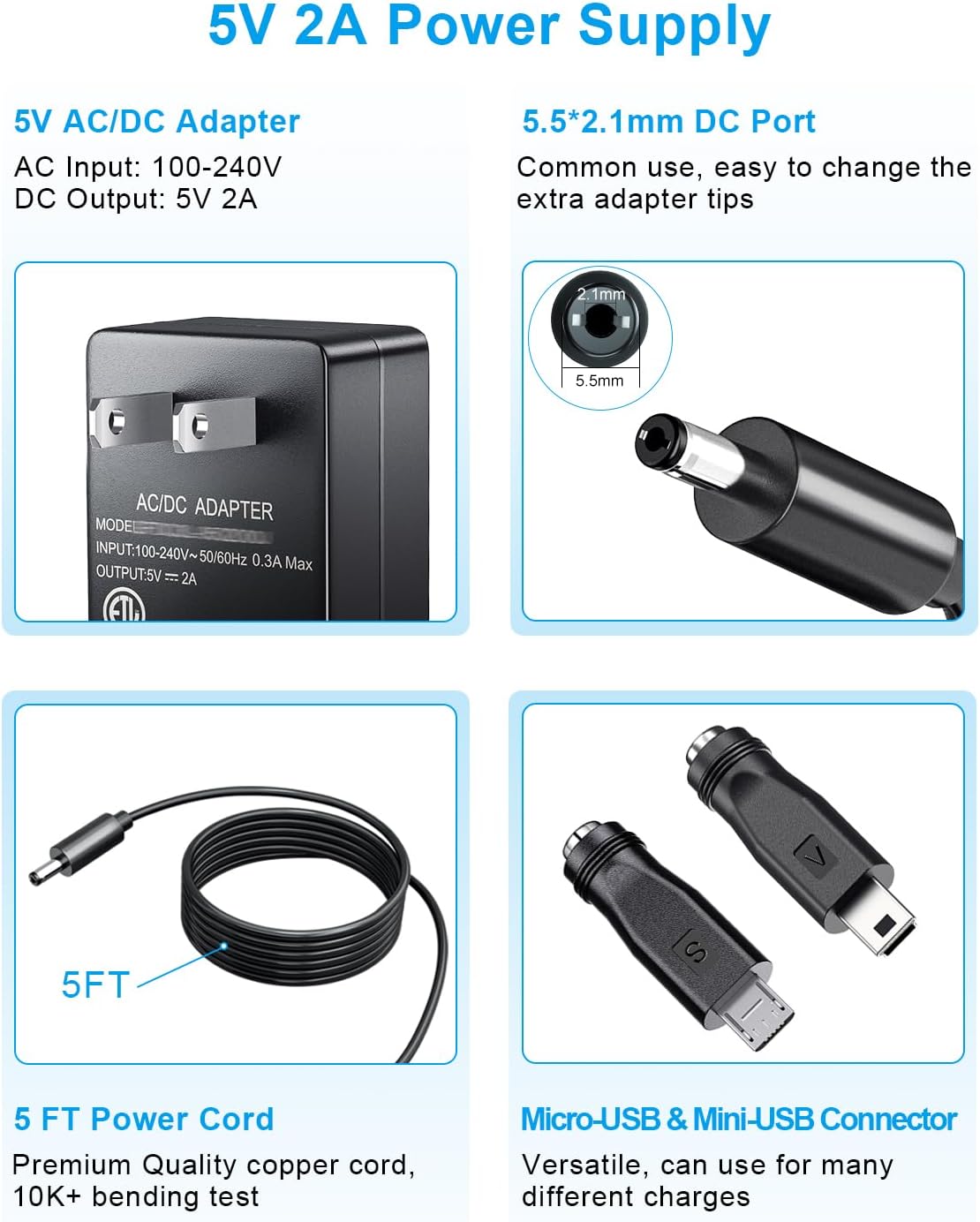 5V POWER SUPPLY: AC 100-240V (50/60Hz) input, DC 5V 2A output (2000mA, 10W), compatible with all 5V devices with a current draw of ≤2A (e.g., 5V 1A/1.5A/1.8A/200mA/1000mA, etc.); comes with a 5-foot (150cm) long cable, and a US plug that fits most outlets (Ensure the device is powered by “DC 5V” (non-5V devices, such as 9V routers and 12V light strips, will not work even when plugged in)