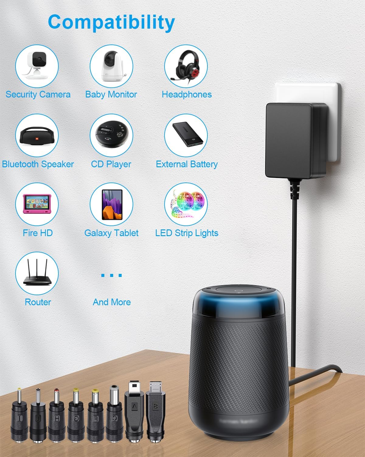 MULTIPLE ADAPTER TIPS: This 5 volt power supply comes with 8pcs common tips, they are Micro-USB ( for Android phones(older model), Ras-Pi (A/A+/B/B+/Zero), cameras, facial cleansing device), Mini-USB( for MP3/MP4 devices/ USB hubs/ baby monitors), 2.5*0.7mm( Mini CCTV cameras/ small GPS/ mini fan), 3.0*1.0mm( Low-power LED night lights/ portable recorders/Victrola retro record players), 3.5*1.35mm( small Bluetooth speakers, keyboards, scales), 4.0*1.7mm( WS2811/WS2812B LED light strips, ADSL modems), 4.8*1.7mm ( routers, laptop cooling pads (low-power)), 5.5*2.5mm(Older CD players, external power banks (for charging), weather stations) ( Note: Measure before purchasing)