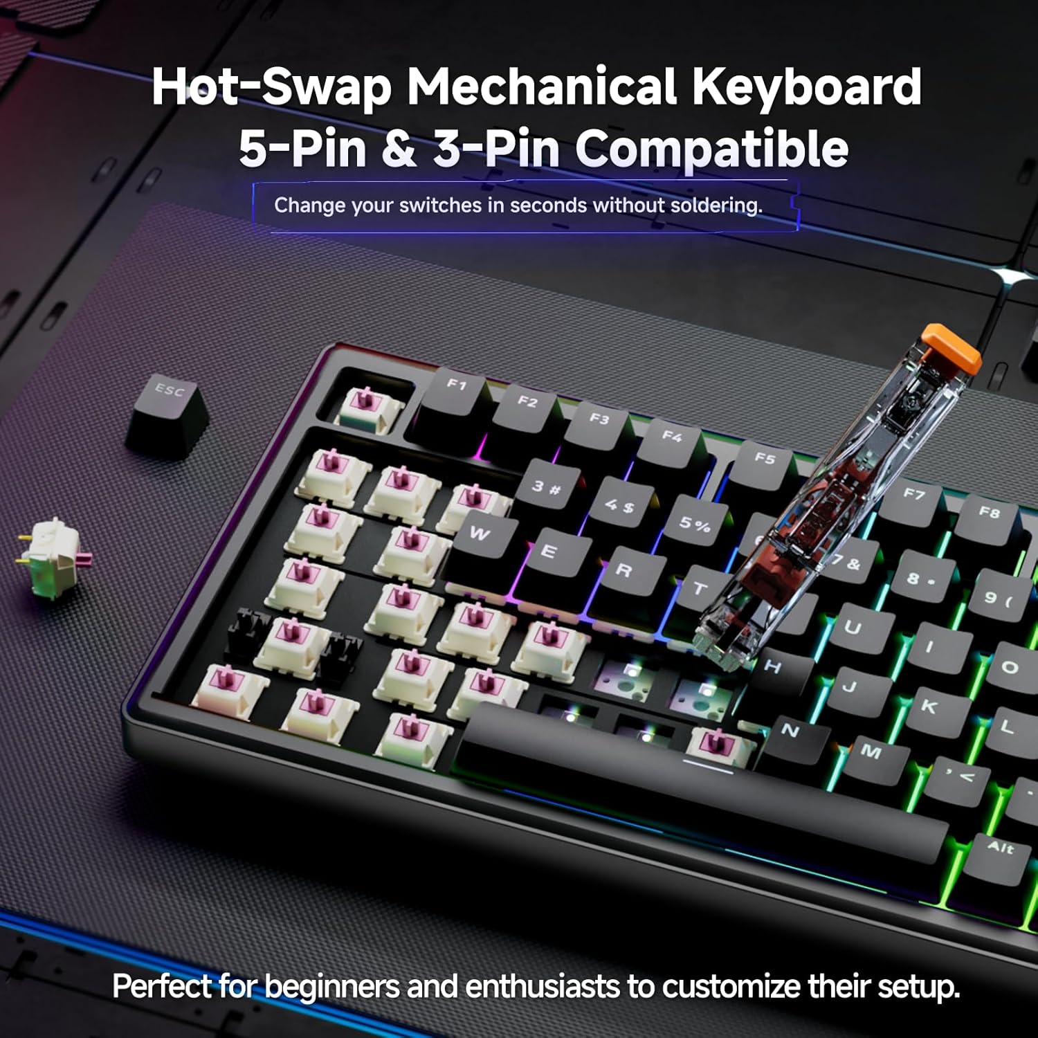 Hot-Swappable Mechanical Switches:Easily customize your typing feel without soldering. The hot-swappable PCB supports most 3-pin and 5-pin MX-style switches, letting you replace switches for different tactile or sound profiles in seconds.