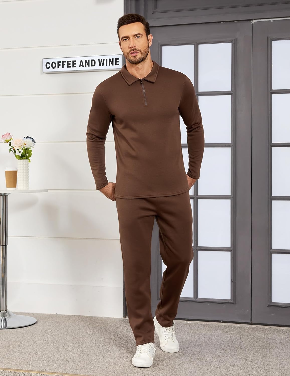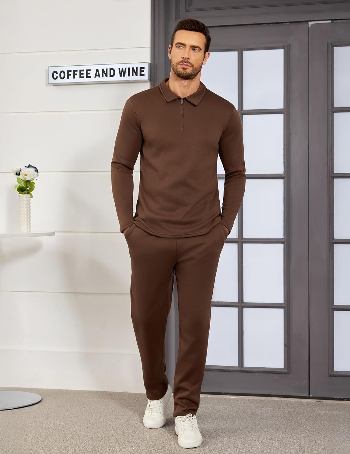 Mens Zipper Polo Top Long Pants Set