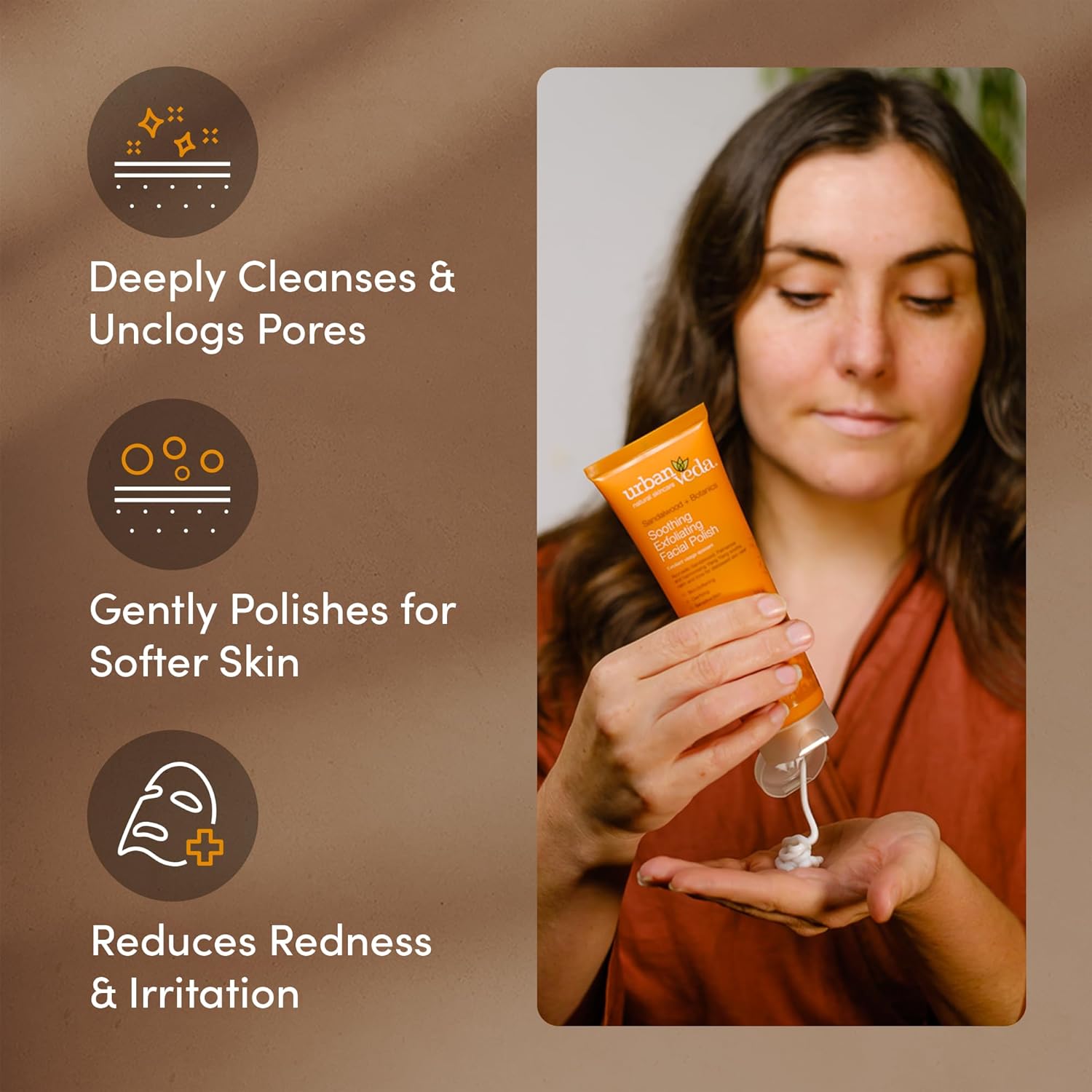 face Revitalise your skincare routine with Urban Veda’s Soothing Exfoliating Facial Polish. Face scrub gently buffs away dead skin cells and unclogs pores using volcanic pumice, while sandalwood, myrrh, and clary sage soothe and moisturise. Perfect exfoliating scrub eriched with ylang ylang, palmarosa, and rose geranium to hydrate, harmonise, and restore radiance. This facial scrub can be used daily or left on as a hydrating face mask for deeper nourishment. Our natural, vegan-friendly formula, making it an ideal choice for those seeking a natural yet effective skincare solution. Join the clean skin club and experience a clearer, more radiant complexion.
