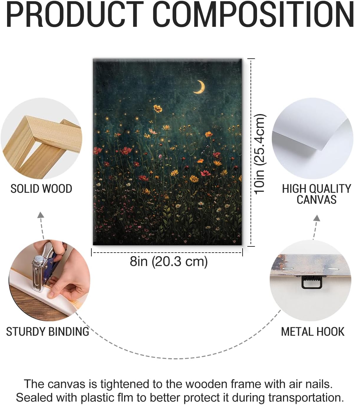 Vintage Moody Wildflowers Wall Art Print – Moon and Flowers Canvas Poster Painting – Aesthetic Wall Decor for Home Farmhouse 8×10 Inch Framed