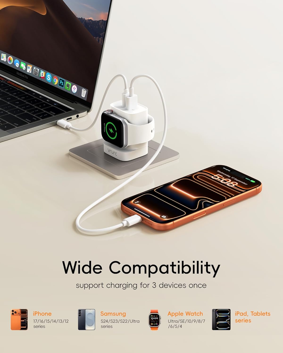 VRURC Charger for iPhone & Apple Watch, 20W USB C Fast Charging Block, 3-in-1 Compact Travel Adapter with 2 Port for iPhone 17/16/15/14/13, Wireless Magnetic for iWatch SE/11/10/9/8/7/6/5/4-White