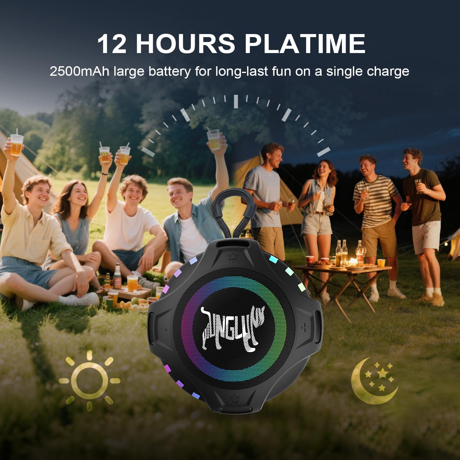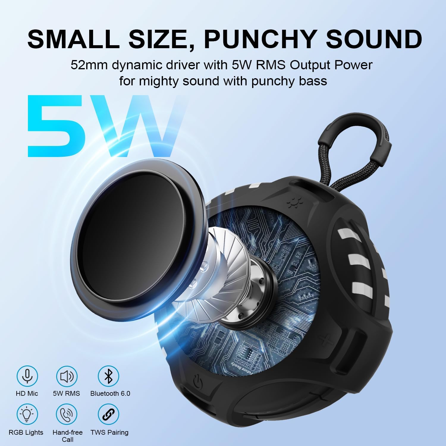 POWERFUL BATTERY – Fast USB-C recharge equipped with 2500mAh rechargeable battery, support for music playback long (determined by volume, led patterns and audio content of speaker played). Bluetooth 6.0 speaker is distortion-free at maximum volume 5W driver output for long-last fun, great for outdoors