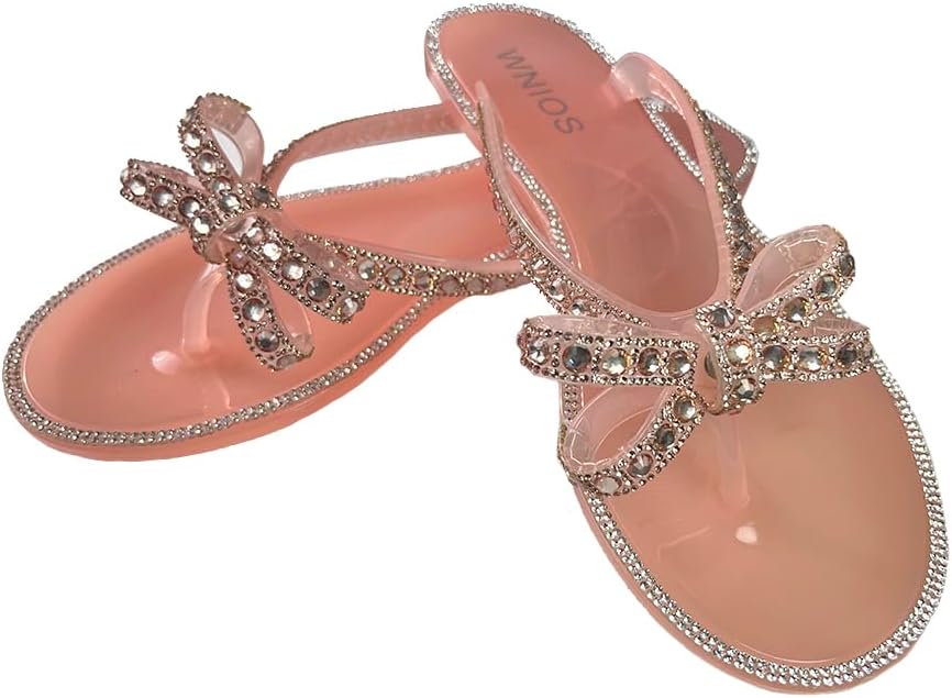 Womens Flat Sandals Jelly Flip Flops Crystals Rhinestones Bow Knot Glitter Sandals