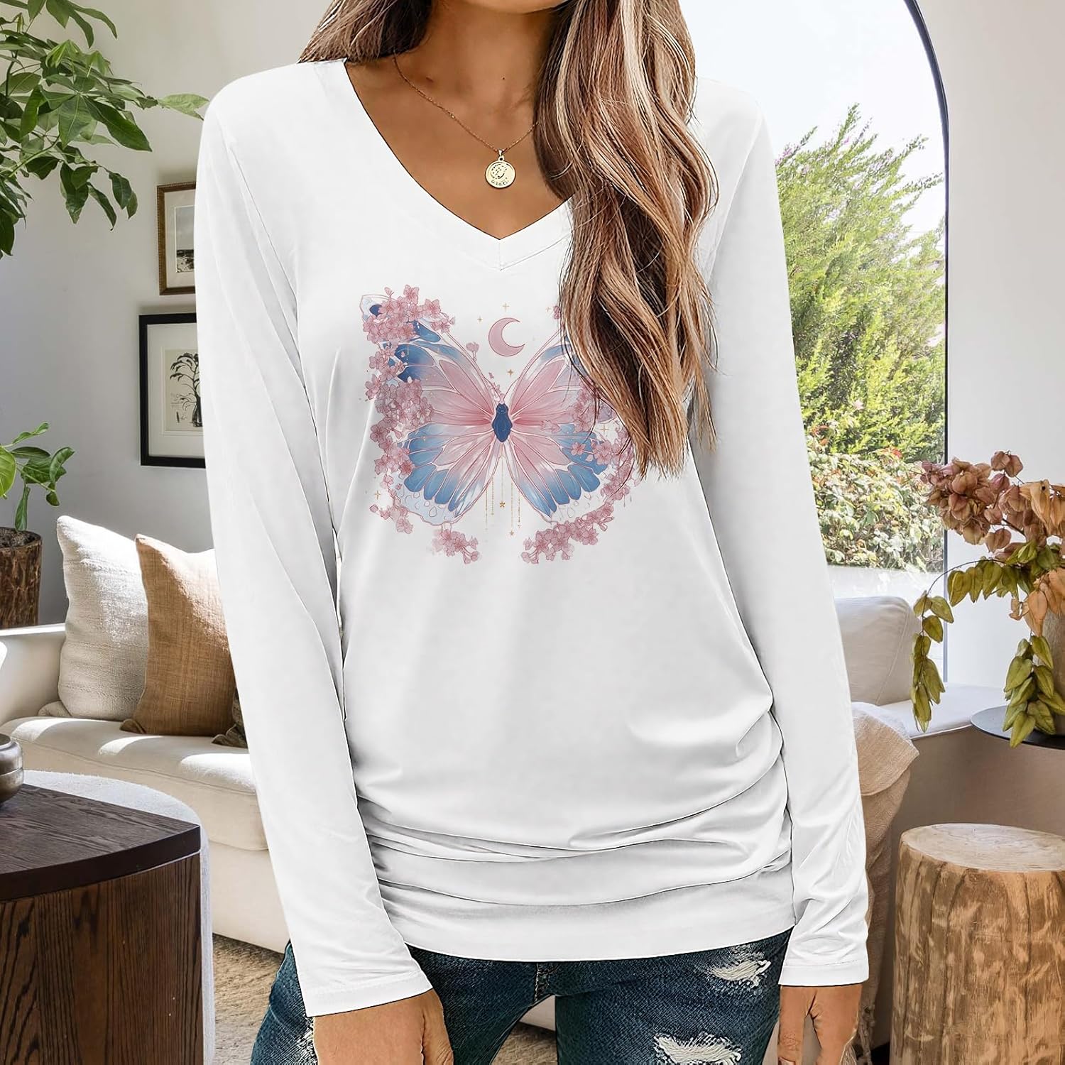 Womens Long Sleeve V Neck Printed Top Lightweight Casual Blouse Soft Tunic for Daily Work Travel