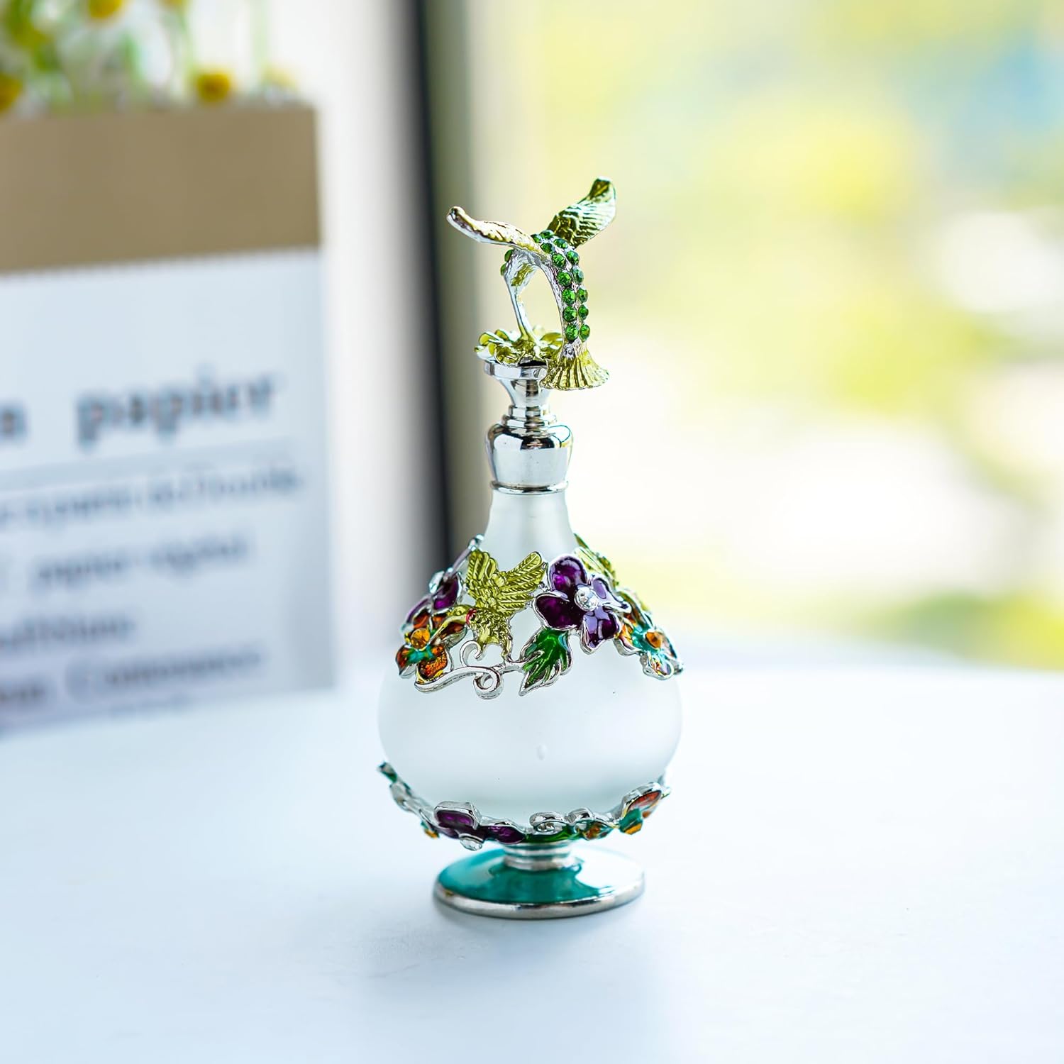 Glass perfume bottle with butterfly hummingbird top and flowers decorated,looks beautiful and elegantMaterial: K9 grade crystal glass and zinc metal alloy. BPA Free & Lead Free & Odourless,you can safely use it for any concoctionWonderful fancy crystal glass bottle collection choice
